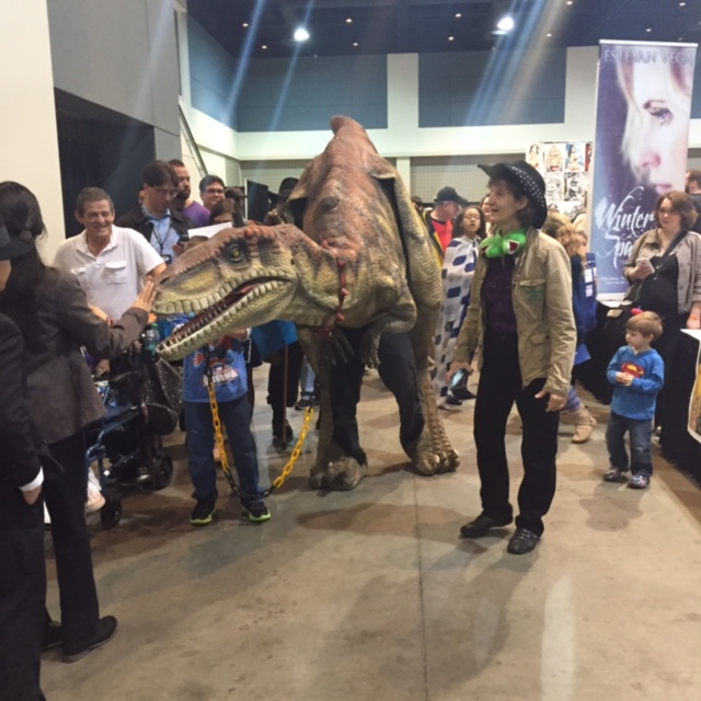 Finally, we enjoyed watching all the cosplayers (and dorks like me, just showing off our nerd pride with t-shirts). Especially this DINOSAUR! He went right up and tried to bite my dude – what nerve!