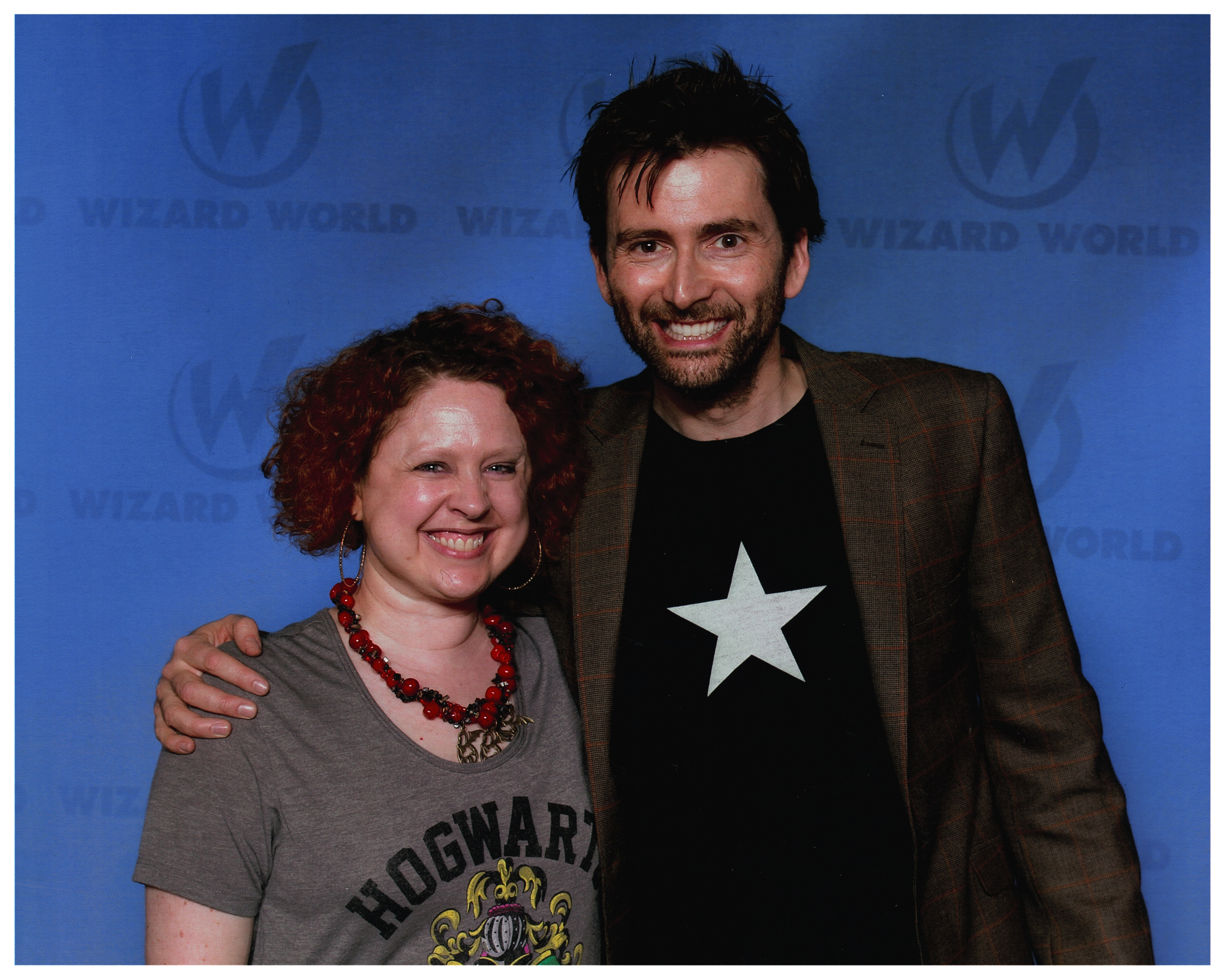 Squee #2 came not long after. We made one more round of checking out the stuff on the main floor (and purchasing another beer for my nerves), and caught a bit of David Tennant’s Q&A panel on the big screen, before queuing up for his photo op. THERE WERE SO MANY PEOPLE! It was not surprising, but astounding all the same. I’m sure his face ached afterwards. We were given three rules before we entered the photo area: No hugging, no posing, and only fist bumps. I was a tad distressed since I planned on asking to do the back-to-back Rose/Ten pose. Oh well. I would behave and do the typical stand and smile pose. Who cares, really, because I’m sharing oxygen with the guy. AND THERE HE WAS. Jeans, cool t-shirt, and blazer. And scruff. I did my best not to hyperventilate. I gave my best cheesy grin and said “HIIIIIII!!!!!” and he returned my greeting with that amazing high Scottish accented voice. Our arms went around each other and click. Done. I said “THANK YOU!!!” and he once again returned my words as enthusiastically. Amazing. My hand lingered for an extra second on his back and then I was out of there. Two Slytherins, being awesome! Squee times infinity!!!